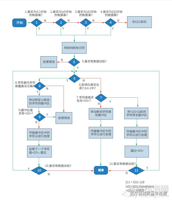 51. 问:UDI 载体使用了符合标准的 GS1-128 或 GS1 DataMatrix,为什么使用环节扫码时只能读出一长串数字字母字符,没有按不同应用标识符分开? 答:建议确认扫码设备是否设置到了识读 GS1 相应条码的模式,相关软硬件是否按照 GS1 标准对条码进行了处理, GS1 条码符号数据处理流程见下图,详见 GS1 条码符号处理流程详见《GS1 通用规范》7.8。