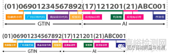 DI:厂商识别代码由 7~10 位数字组成,中国物品编码中心负责分配和管理。厂商识别代码的前 3 位代码为前缀码,国际物品编码协会已分配给中国物品编码中心的前缀码为 690~699;商品项目代码由厂商识别代码所有人(即商品条码系统成员)依据有关国家标准自行分配;校验码由标准算法得出。 PI:包含医疗器械序列号、生产批号、生产日期、失效日期等。 (基于GS1标准的唯一器械标识(UDI)编制规范实现医疗器械可追溯-中国物品编码中心)
