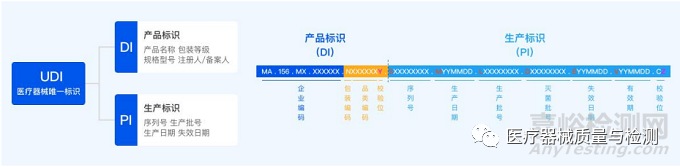 DI:由国家前缀码 3 位;行业标识符 2 位;注册人代码 6 位;包装指示符 1 位;产品代码 6 位;校验码 1 位组成。 PI:包含医疗器械序列号、生产批号、生产日期、失效日期等。 (UDI 发码服务平台-idcode.org.cn))