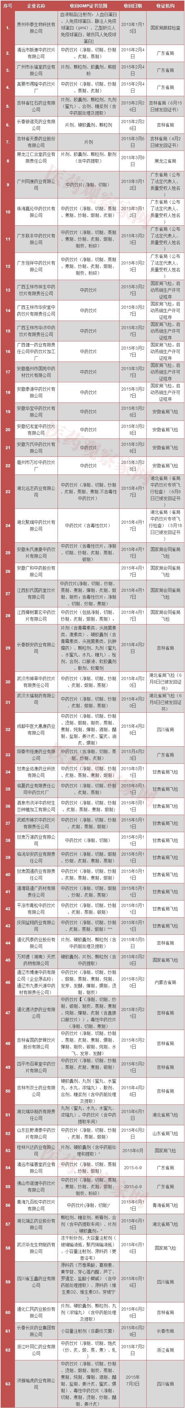 截止至2015年7月7日,据医药观察家网不完全统计,共有63家药企被收回GMP证书,远远超过了2014年收回GMP证书的50家药企,药品监管再接再厉!