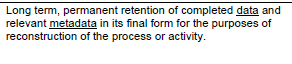 指在规定的数据保存期内,保护数据免于被修改或删除,并在独立的数据管理人员控制下储存这些记录的过程。归档的记录中应当包括相关的元数据和电子签名等。