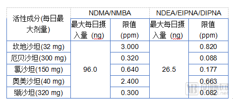 随后,FDA又在某些氯沙坦产品中发现了新亚硝胺杂质,即N-亚硝基-N-甲基-4-氨基丁酸(NMBA)。根据初步评估,暴露于NMBA的患者患癌症的风险增加比例与暴露于NDMA的患者相似,但低于暴露于NDEA的风险。2019年2月28日,FDA发布了血管紧张素Ⅱ受体阻滞剂(ARBs)中NDMA、NDEA和NMBA杂质临时限值(见下表)