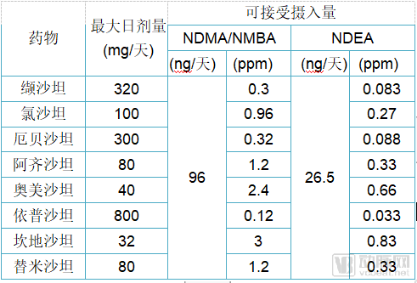 2019年1月31日,EMA建议生产沙坦降压药的公司审查其生产工艺,以避免产生亚硝胺杂质,并根据现行国际准则,为NDMA和NDEA设定了过渡期临时限值。通过基于动物研究中每种杂质的最大每日摄入量(NDMA:96.0ng,NDEA:26.5ng),除以每种活性物质的最大日剂量,计算得到限值(见下表)。