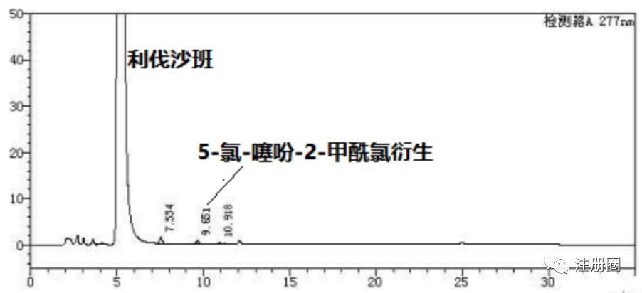 | | | | | HPLC-紫外: 色谱柱:Alltech Apollo C18,4.6×250mm,5μm; 流速:1.0ml/min;柱温:室温;波长:206nm; 甲醇-水=82:12(v/v)等度洗脱 | ⁴利伐沙班中基因杂质5-氯噻吩-2-甲酰氯的测定 | | HPLC-紫外: 色谱柱:Waters Shield RP C18,4.6×250 mm,5 μm;流速:1.0 mL/min,柱温:35 ℃;波长277 nm; MpA:0.02 M磷酸二氢钾(pH3.0)-乙腈=90:10 (v/v) MpB:乙腈 梯度洗脱: 文献未提供梯度 |