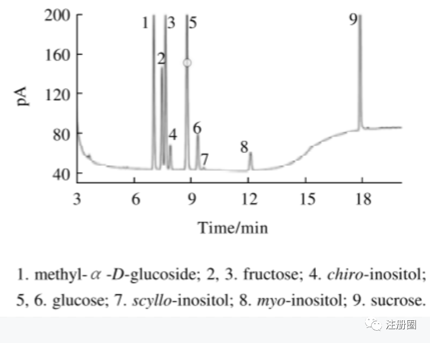 色谱柱:DB-5MS毛细管柱,0.25mm×60m,0.25μm;进样口250℃;载气He;流速1.2ml/min;不分流; 升温程序: MS:EI源,m/z=169 | ⁷不同柑橘中的肌醇检测 | | GC-FID: