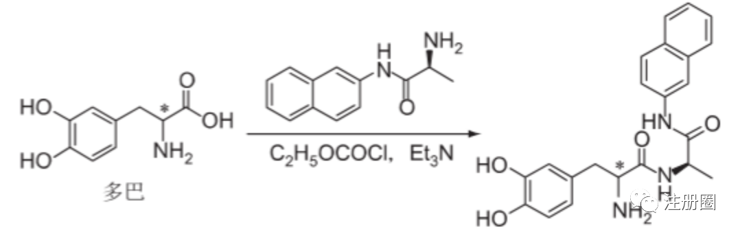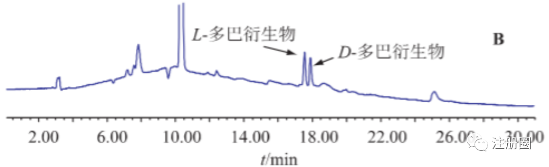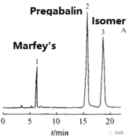 ③手性构型翻转。有些化合物由于较难找到合适的手性色谱柱对对映体异构体杂质进行分离,通过衍生反应引入其他手性结构使待测物构型翻转从对映异构体成为非对映异构体,使用普通C18色谱柱就可以实现分离;