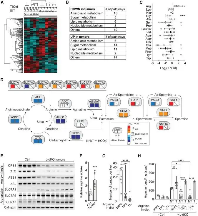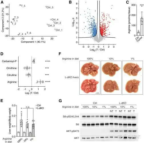 为了揭示 HCC 中的代谢变化,研究人员首先利用 mTOR 驱动的 HCC 小鼠模型中分离的肝肿瘤进行了非靶向代谢组学研究。观察到 L-dKO(特异性肿瘤抑制基因TSC1和PTEN双基因敲除)肿瘤中发生了明显的精氨酸代谢改变——肿瘤细胞中精氨酸水平显著升高(肿瘤细胞本身很少或不产生精氨酸),且高水平的精氨酸是肿瘤生长所必需的。