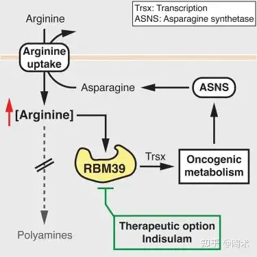 小结总的来说,肿瘤细胞通过增加精氨酸的摄入并减少其向多胺的转化,从而积累高水平的精氨酸。这种高水平的精氨酸重新编程了代谢,进而促进了肿瘤的发展。精氨酸通过结合到 RBM39,控制代谢基因的表达,尤其是通过促进 ASNS 的表达,从而刺激天冬氨酸的合成,进一步加强了对精氨酸的吸收,形成了一个正反馈循环,维持了高精氨酸水平和致癌代谢。
