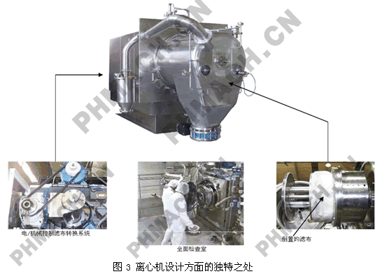 意大利高密康多公司生产的HT型卧式翻袋离心机相比于其他的离心机在结构的设计上有些不同的特点,如下图3所示。