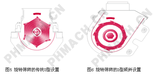根据以上作用原理,德国Alexanderwerk公司首创筛网腔“D”型设计并申请了专利,如图5、图6所示。