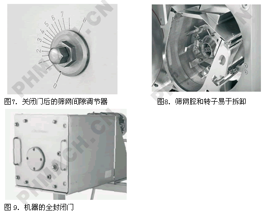 除此之外,RFG 250D系列转子精细粉碎机的设计满足了制药工业的要求:(1)采用医用级不锈钢制造,并且所有非金属材料符合FDA相关要求;(2)门置于前端,方便检修;(3)可替换的不同形状的转子通道,便于对不同物料的粉碎;(4)筛网可适应筛目变换;(5)可以从外面由一个离心导槽重复调整筛网与转子的间隙,操作方便(如图7所示);(6)筛网腔和转子易于拆卸,便于清洗(如图8所示);(7)有悬臂转子轴承(D型)或双面转子轴承( DL和DDL 型)可供选择;(8)全密封设计,不产尘,不积尘,符合GMP要求(如图9所示);(9)设备设计紧凑,便于安装,甚至安装多台;(10)还有更多可选择:在线清洗;防爆设计;调节速度的控制台;置于可移动的台车上等,可按照URS进行设计。